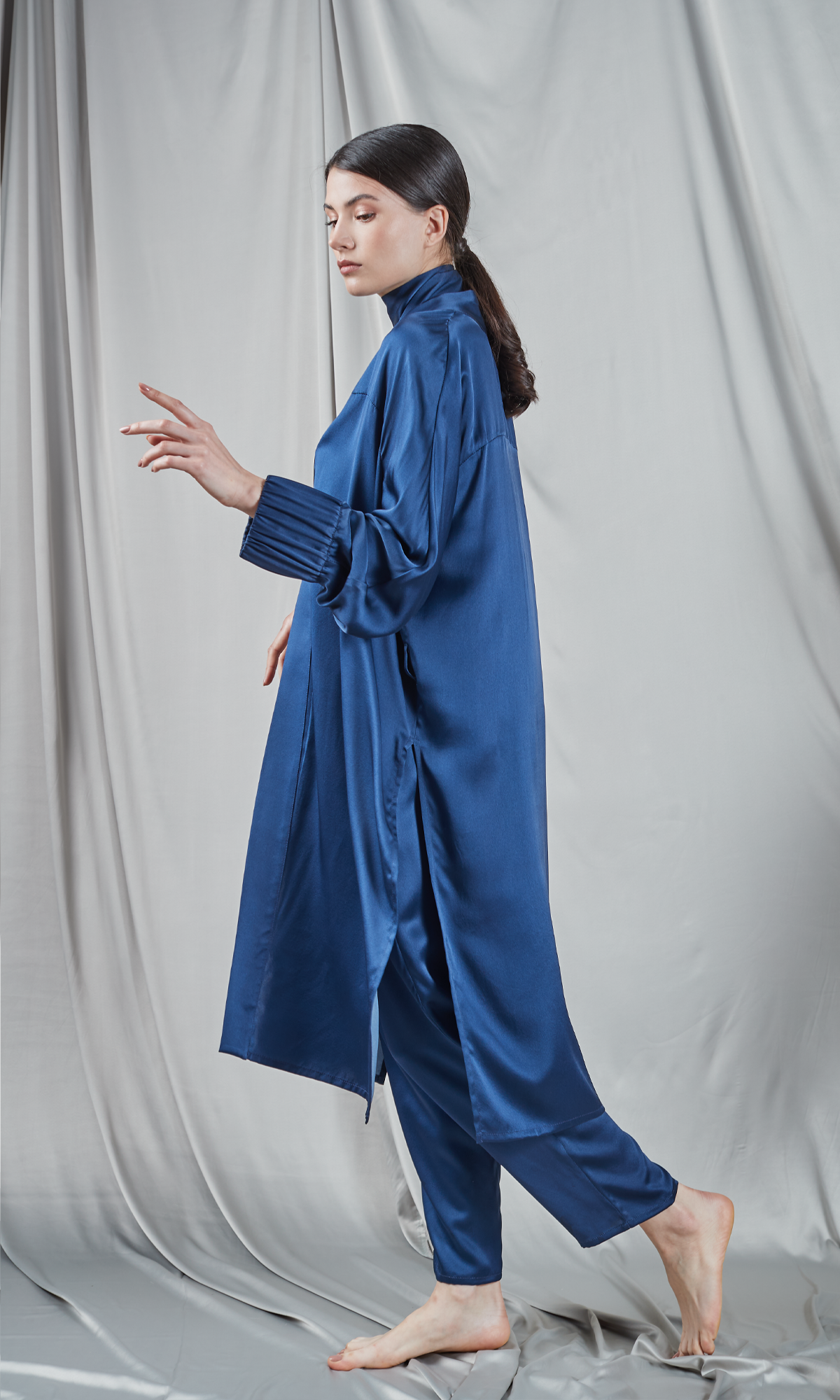 Kimono in a beautiful shade of navy blue, a paragon of elegance and comfort. It's made from lustrous silk, which gives it a luxurious look and a fluid drape. The simple, clean-lined design is embellished with a high collar that adds contemporary detail. The long sleeves are finished with elastic cuffs, bringing a subtle contrast of shape and texture. The kimono is open at the front and can be cinched at the waist with a matching drawstring, allowing for adjustment to suit your preference. The piece can be worn in a variety of contexts, whether as an extra layer of elegance over an evening outfit or as the main piece in a relaxed outfit at home