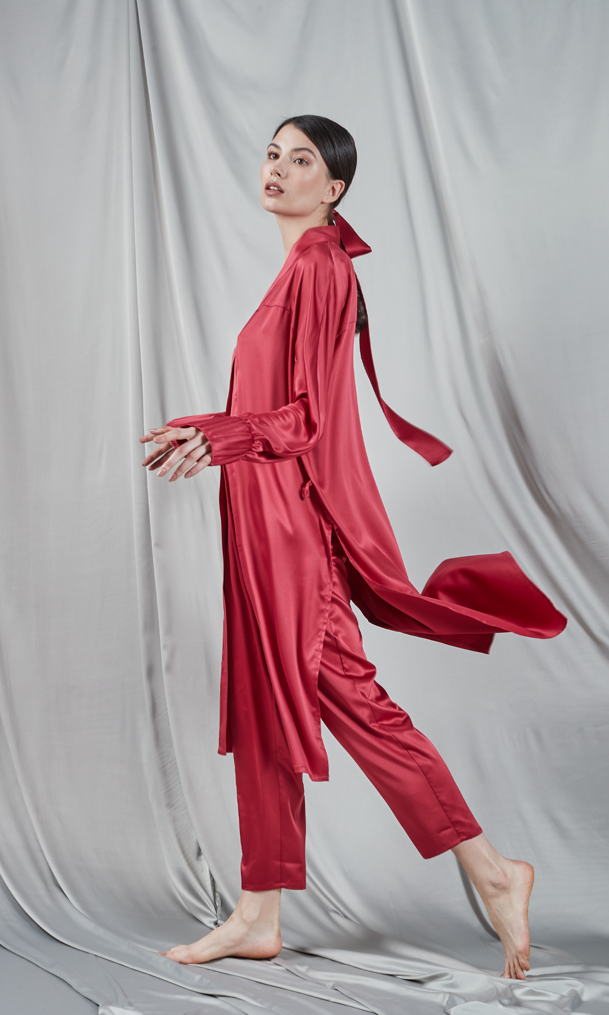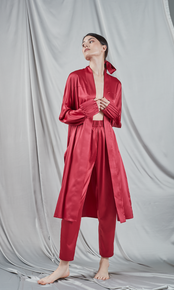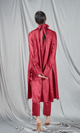 These palazzo pants are cut from burgundy red satin. They have a high, elasticated waist for comfort and a flattering aesthetic. The wide, flowing cut of the pants creates a relaxed and elegant silhouette, perfect for both everyday outfits and special occasions. The vibrant color and silk fabric add an element of luxury and sophistication. These pants are a style statement thanks to the rich hue and fine texture