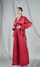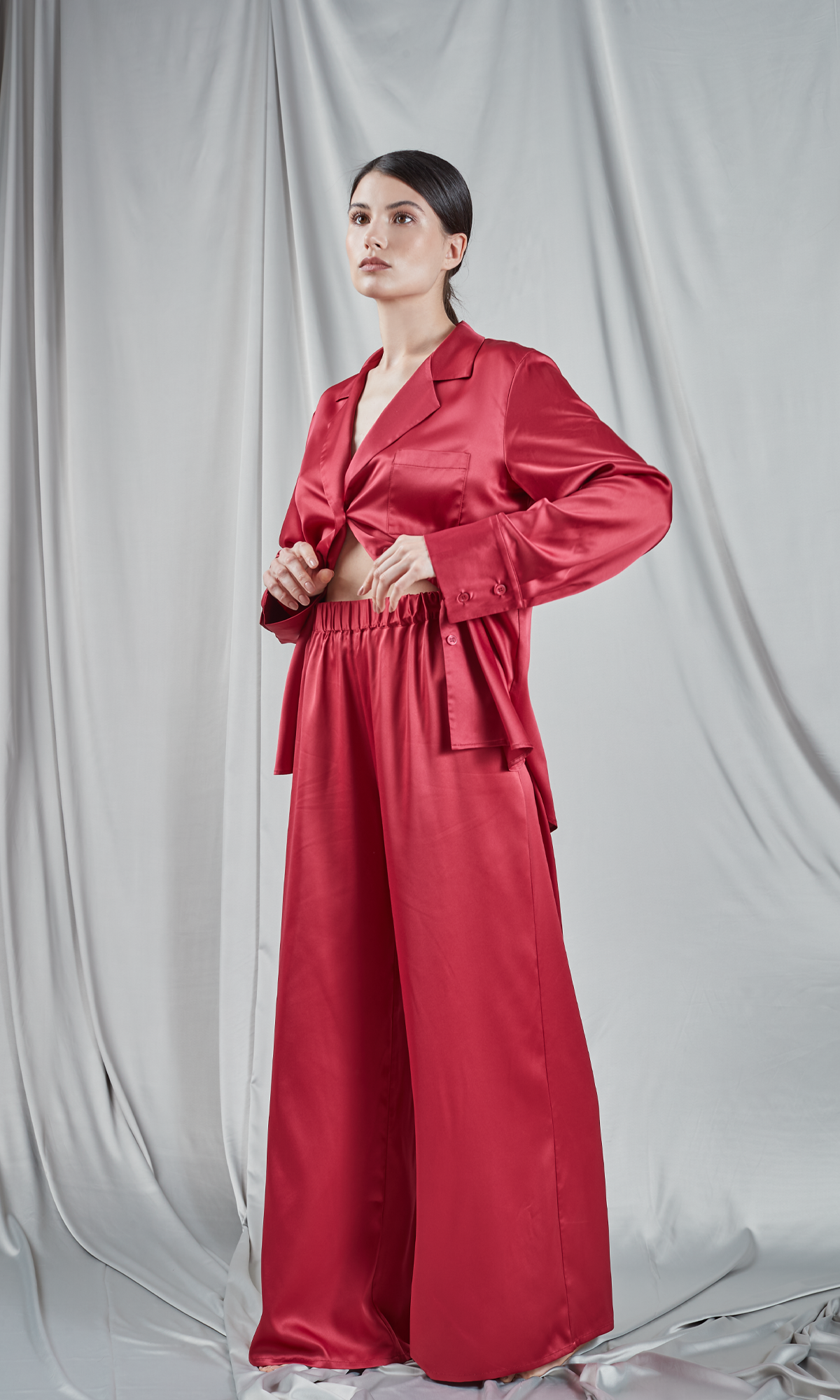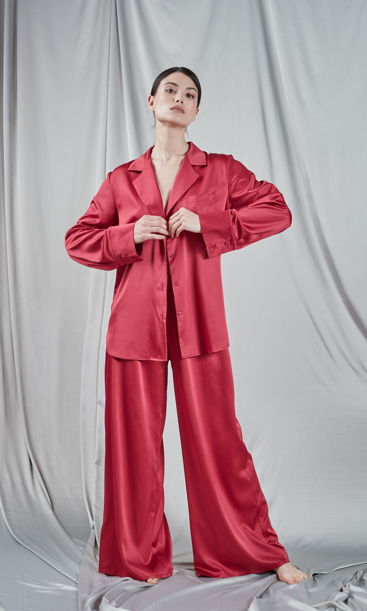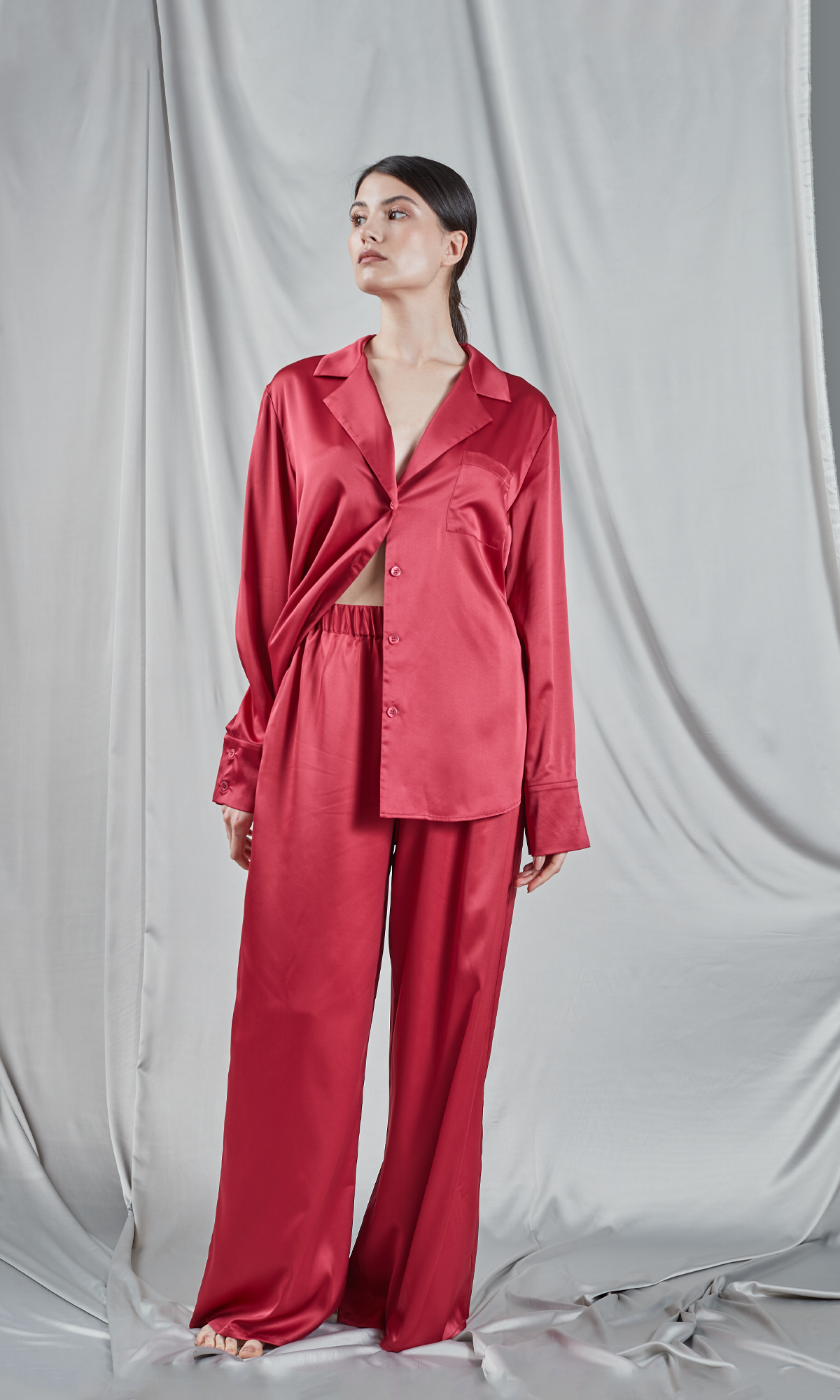 Sleek set consisting of a shirt top and palazzo pants, both pieces made from a burgundy-red fabric. The shirt has a classic collar, long sleeves and button front fastening, adding a classic and refined touch to the ensemble. The pants have a high, elastic waistband that offers comfort and a relaxed fit, and the loose-fit of the pants completes the sophisticated and modern look of the ensemble. This combination is ideal for relaxing moments at home while maintaining an air of luxury and comfort. The lustrous silk material emphasizes the feeling of sophistication and comfort you can wrap yourself in