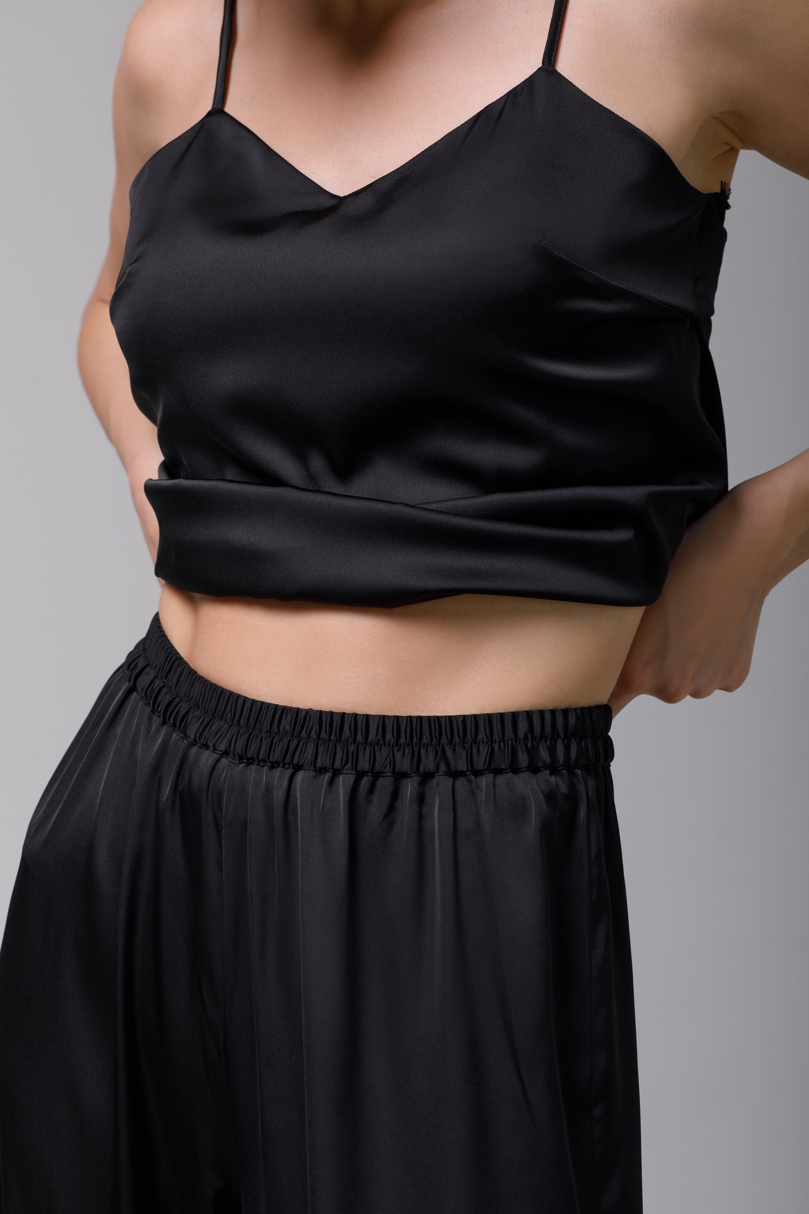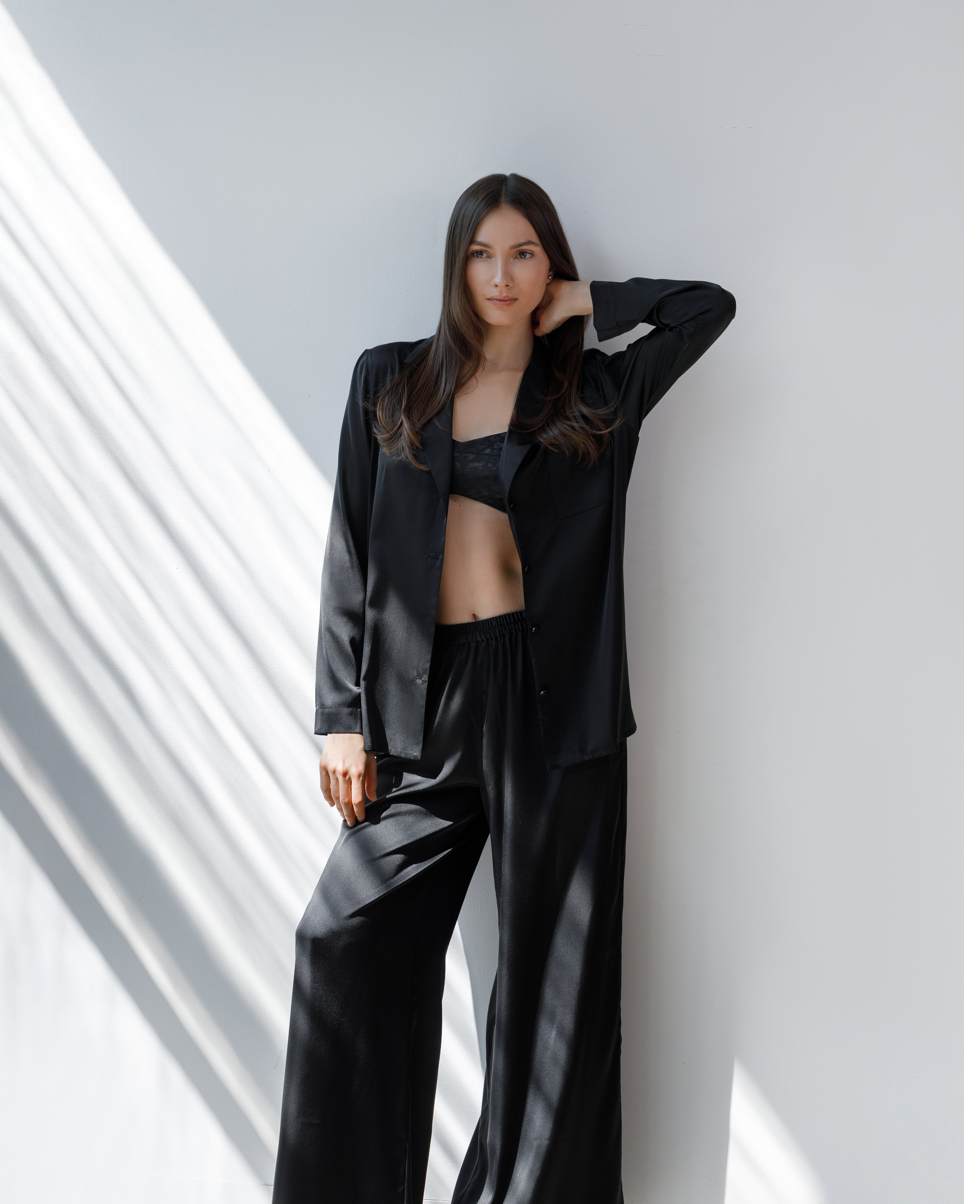 The exquisitely elegant palazzo pants are crafted from high-quality satin in a deep shade of black. Their loose-fit design offers a modern and sophisticated silhouette. The high, elasticized waist ensures both comfort and an effortless fit, ideal for all-day wear or special events. The fluid silk falls beautifully down the legs, creating graceful movement and a luxurious look. These pants can be worn as part of a coordinated ensemble with a silk top or as the focal point of an outfit with a simple blouse, adding a touch of opulence to any look