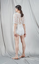 Casual-elegant patterned t-shirt in ivory color. The modern design includes a wide round collar and short sleeves, detailed with floral lace inserts that add a touch of finesse. The knit has a loose and relaxed loose fit with a rounded hem that offers a fluid and comfortable fall. It is made from silk giving a touch of luxury and comfort. This versatile piece is perfect in your everyday wardrobe or as part of a lounge or pajama ensemble