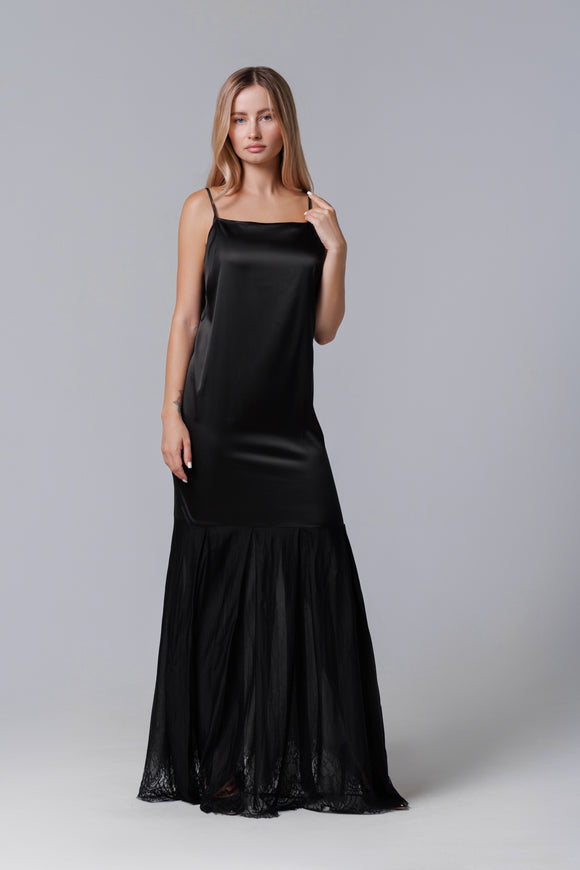 Long black satin dress with lace