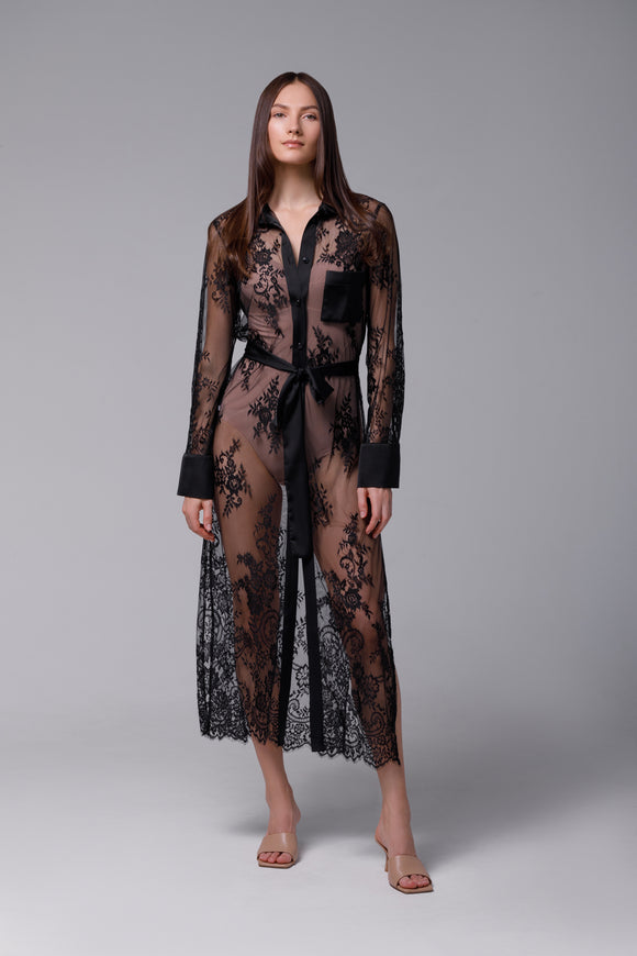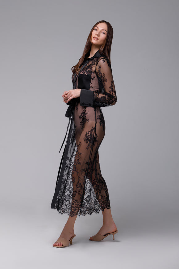 Long black dress in satin and French lace
