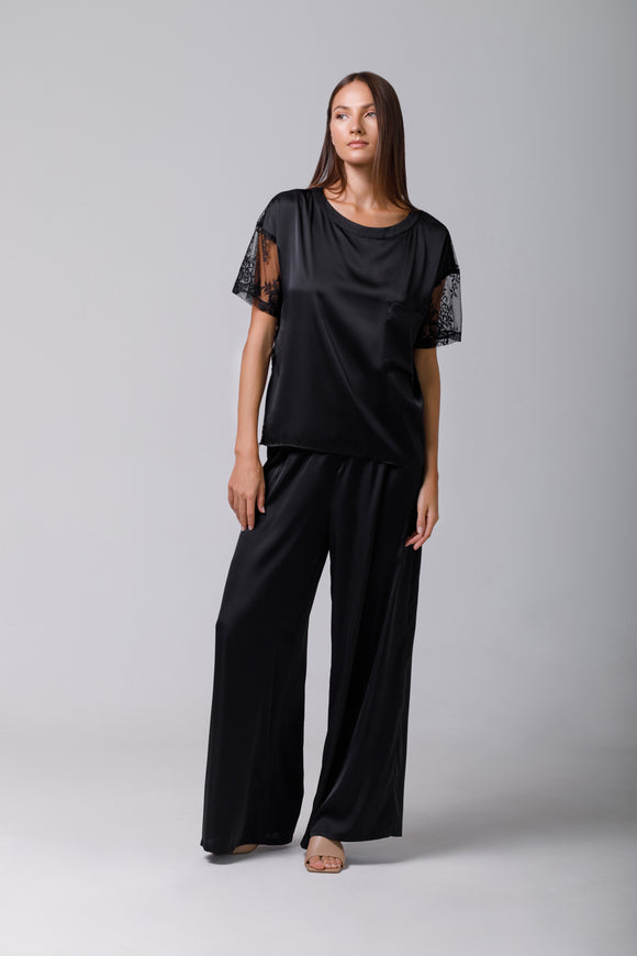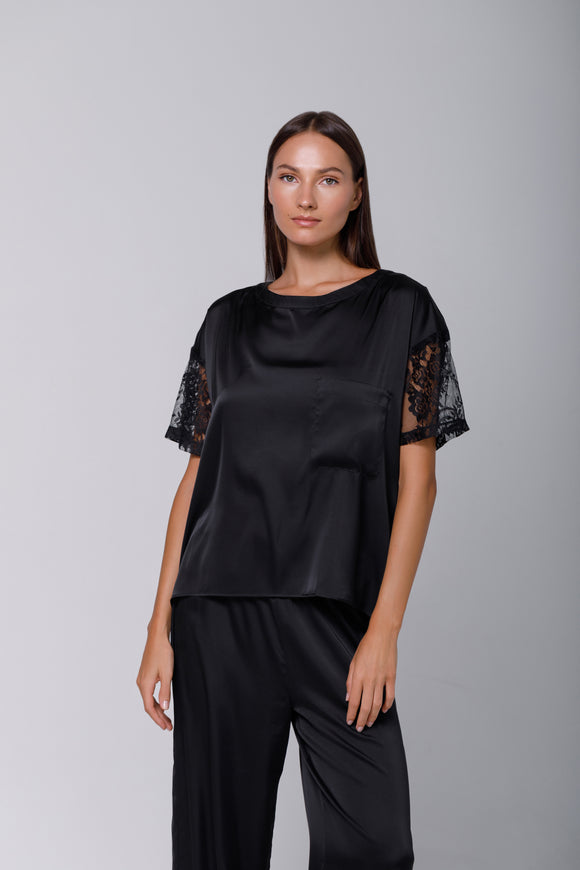 Black satin T-shirt with lace