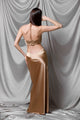 The champagne-toned long gala dress is a masterpiece of craftsmanship and style, creating a silhouette that highlights and celebrates the feminine form. The high-quality satin content gives it a lustrous sheen and fluid drape, while strategic cutouts at the waist and a deeply nude back add an air of sensuality. The slim, adjustable straps allow for a perfect fit to your body shape, and the deep V-neckline gracefully complements the neckline. Whether worn for an evening event or as a daring choice for a wedding, this dress is destined to catch the eye and stay in the memory