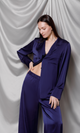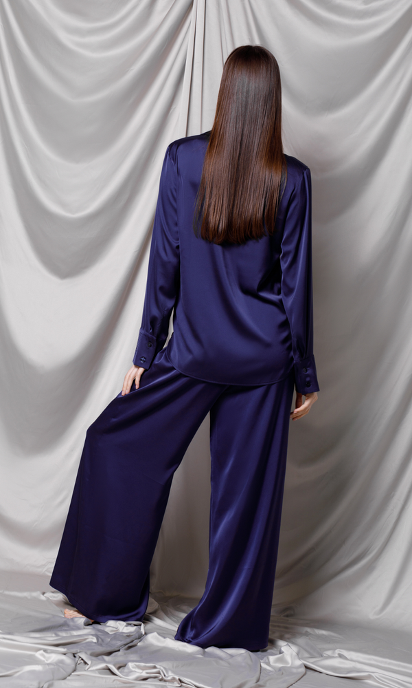 The exquisitely elegant palazzo pants are crafted from high-quality satin in a deep navy blue. Their loose-fit design offers a modern and sophisticated silhouette. The high, elasticized waist ensures both comfort and an effortless fit, ideal for all-day wear or special events. The fluid silk falls beautifully down the legs, creating graceful movement and a luxurious look. These pants can be worn as part of a coordinated ensemble with a silk top or as the focal point of an outfit with a simple blouse, adding a touch of opulence to any look