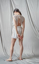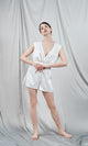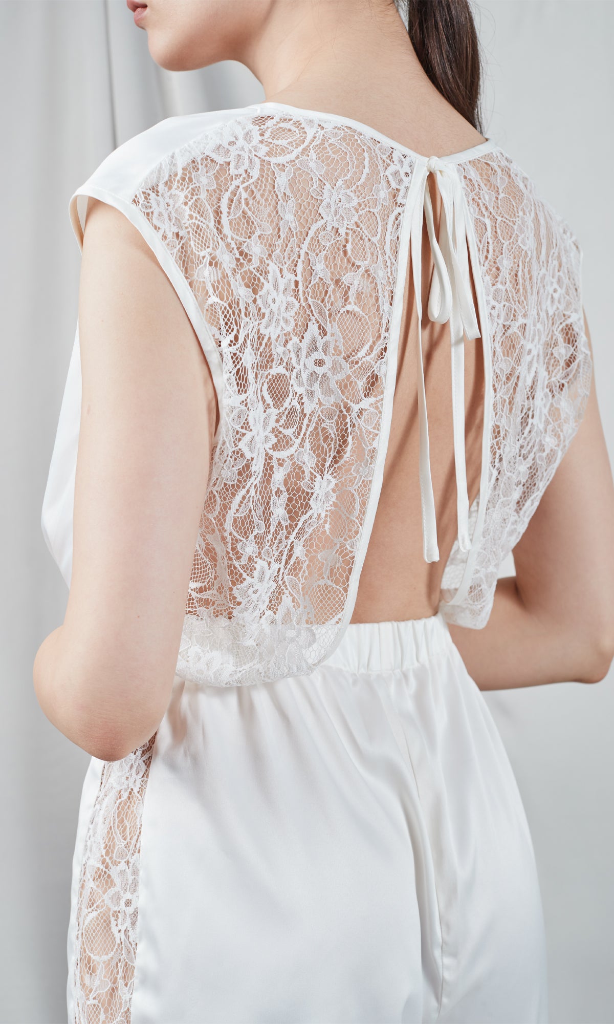 Feminine and sophisticated jumpsuit in ivory satin. The top has a generous V-neckline that adds a seductive air to the piece, and the back is decorated with a fine ivory lace insert, complemented by a delicate tie that allows for adjustment. The jumpsuit's elasticized waist highlights the silhouette, while the shorts add a playful and comfortable look. The combination of silk and lace suggests a balance between elegance and sensuality, making this piece perfect for a variety of occasions, from a relaxing evening at home to a casual night out