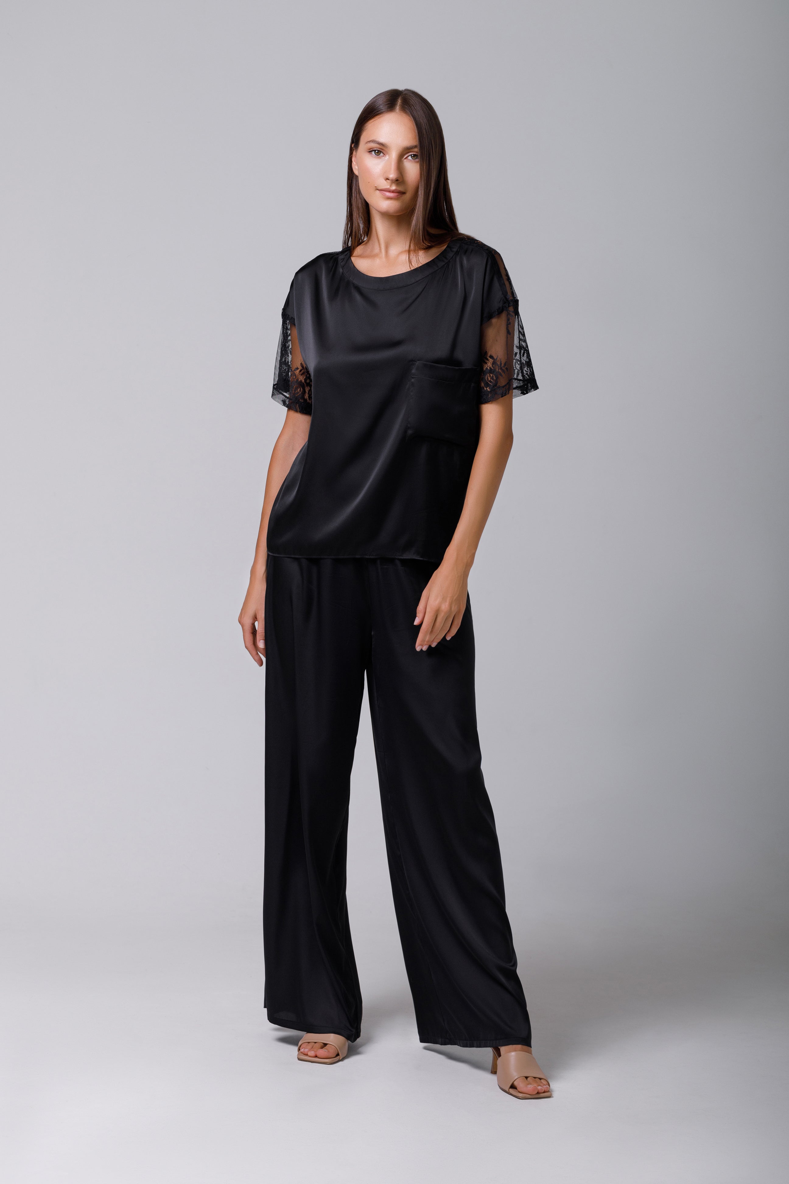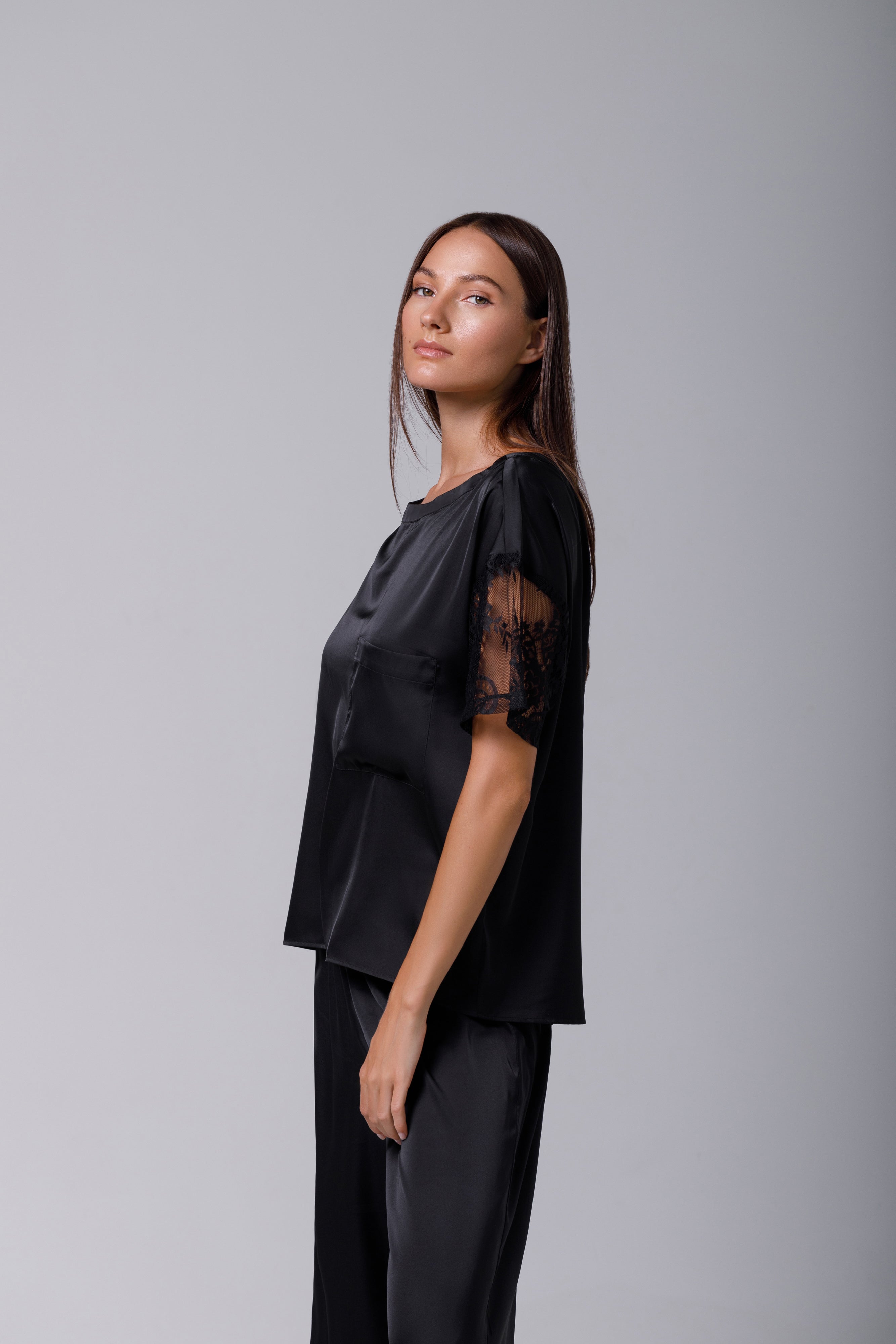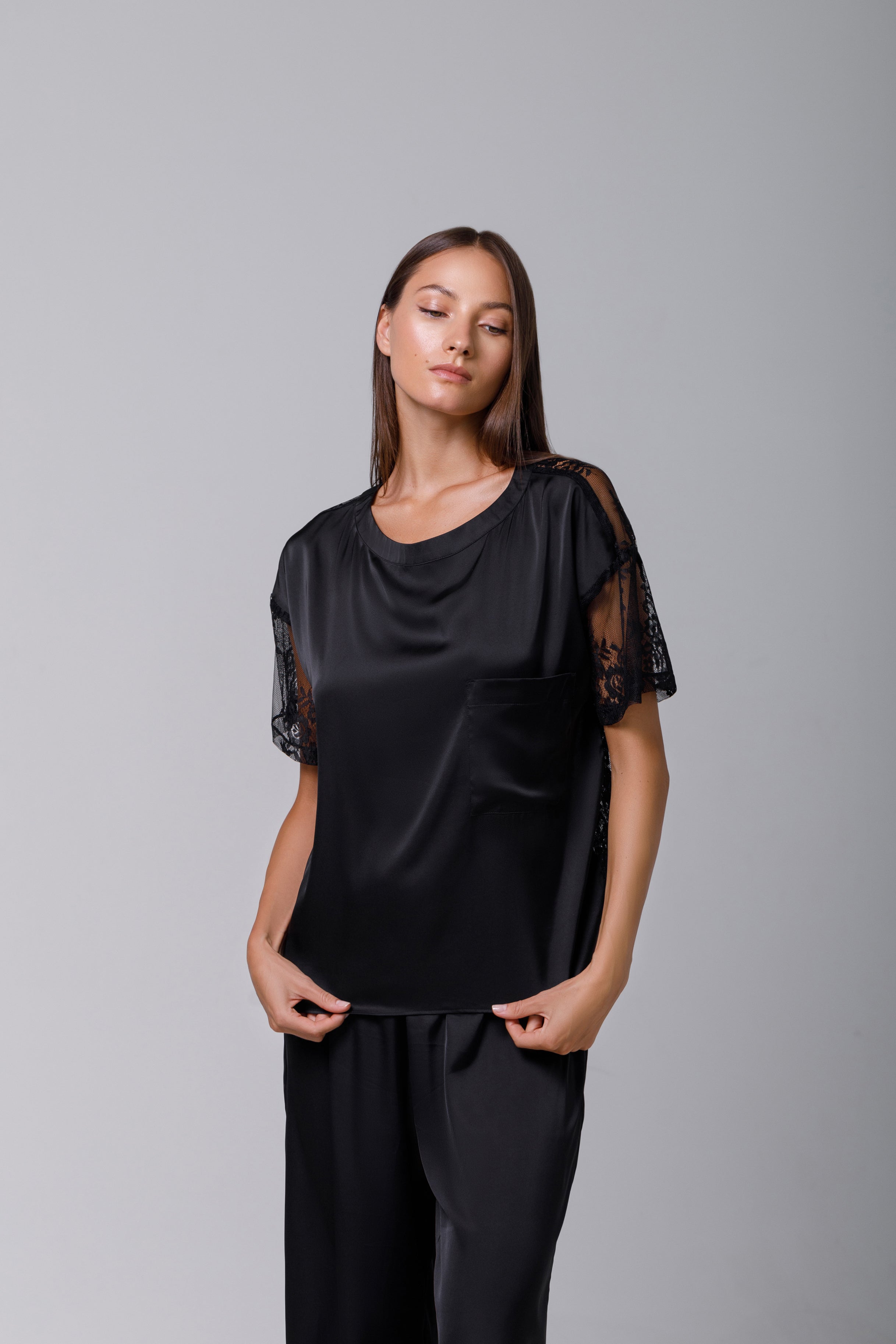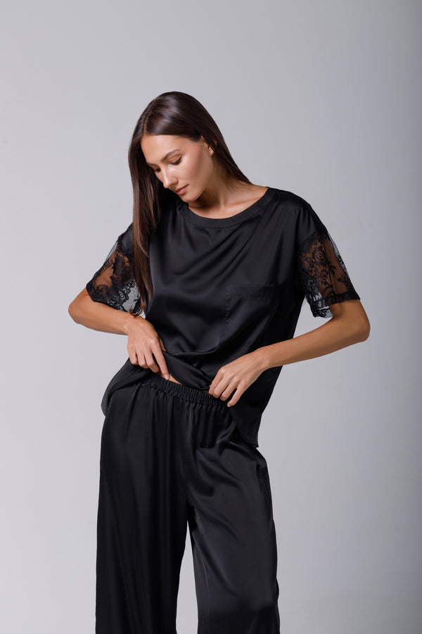 Discover the understated elegance of this shirt that combines the luxury of satin with a simple, refined design. Crafted from a luxurious silk, this shirt is distinguished by its loose fit that sits elegantly on the body. The round neckline adds a classic feel, while the integrated short sleeves in matching lace drape gracefully off the shoulders for a flattering shape. You can pair this shirt with shorts or pajama pants for a look that's both comfortable and stylish. The versatility and sophistication of this shirt make it an essential staple in your wardrobe